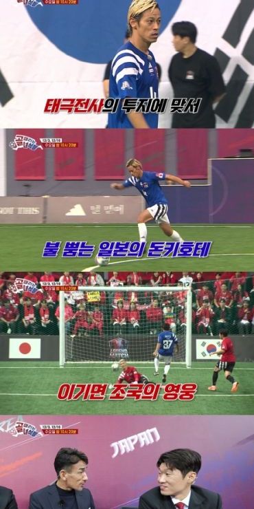 오는 12월 3일(수) 밤 10시 20분 첫 방송되는 ‘레전드 한일전’은 대한민국과 일본을 대표하는 세대를 초월한 올타임 축구 레전드 14인이 국가대표 유니폼을 다시 입고 자존심을 건 5:5 미니 축구 대결을 펼치는 프로그램이다. 좁은 공간에서 벌어지는 고밀도 경기 속에서, 이기면 조국의 영웅, 지면 나라의 역적이라는 극단적 압박 속에 숨막히는 승부가 예고된다.
