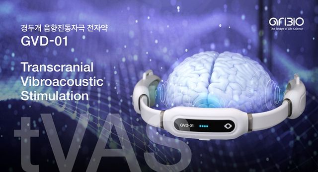 아리바이오 GVD-01은 알츠하이머병 환자의 40Hz 감마파 및 뇌 혈류 감소를 개선하는 비침습적 치매 전자약이다. 경두개 음향진동자극(tVAS) 기술을 통해 뇌신경망 활성화 및 인지기능 저하 억제 등을 목표로 개발됐다.