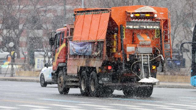 도로에 염화칼슘을 뿌리고 있는 제설차. / 뉴스1