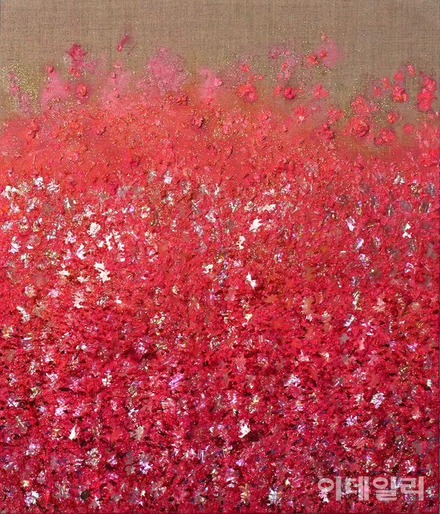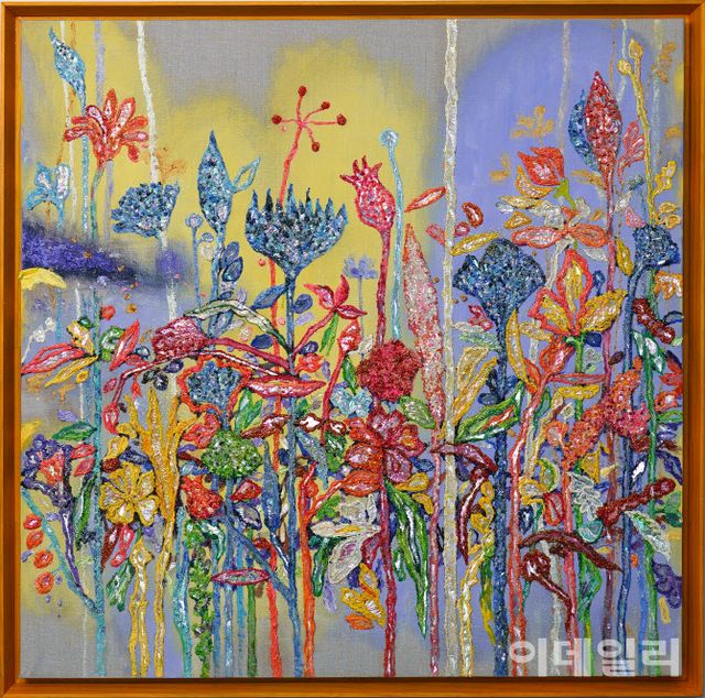 [이데일리 오현주 문화전문기자] 문득 떠오르는 게 있다. 하얀 천이든 색 천이든 그 위에 알록달록한 색실로 한 땀 한 땀 수를 놓은 작품. 딱 그 화면이 아닌가. 손가락을 부르는 올록볼록한 터치하며 그렇게 곧 튀어나올 듯한 입체감으로 캔버스를 채운 모양이 말이다. 그런데 과연 그럴까. 정말 바느질로 이룬, 꽃들이 만개한 정원의 풍경인가 말이다. 아니다.