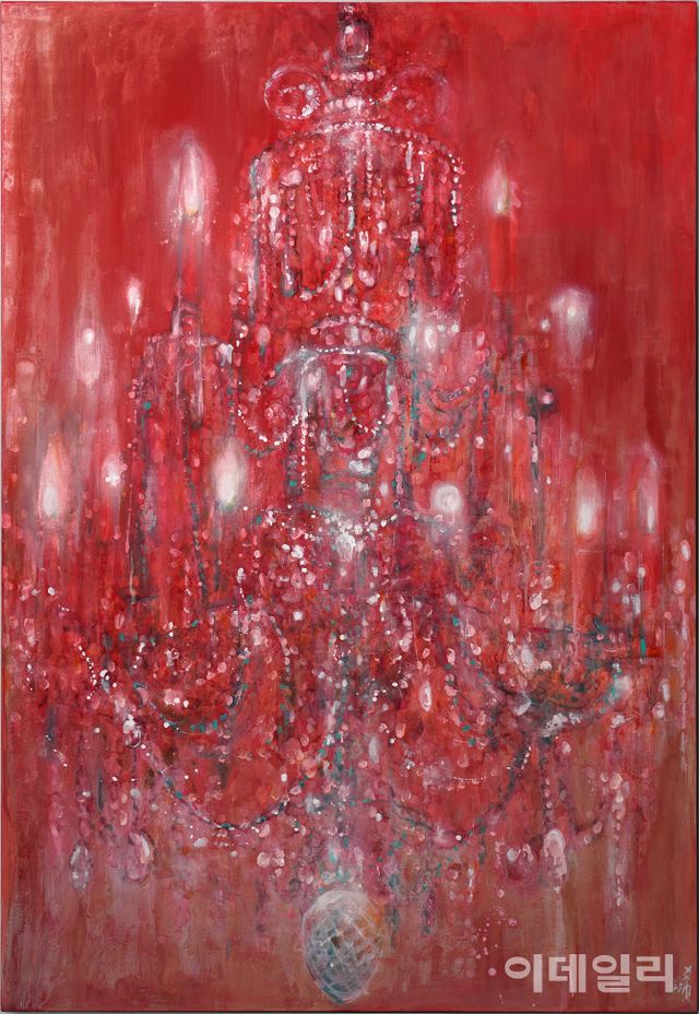 [이데일리 오현주 문화전문기자] 붉은 공간에 매달린 형상은 ‘샹들리에’다. 눈이 부시게 반짝이는, 영롱하고 투명한 빛 잔치를 펼치는 여느 샹들리에와는 사뭇 다르다. 핏빛 선홍색에 잠식당해 있으니까. 하지만 샹들리에의 빛이 어딜 가겠는가. 짙고 탁한 공기속에 용케 살아남았다. ‘유리’라는 재료 덕분이다.
