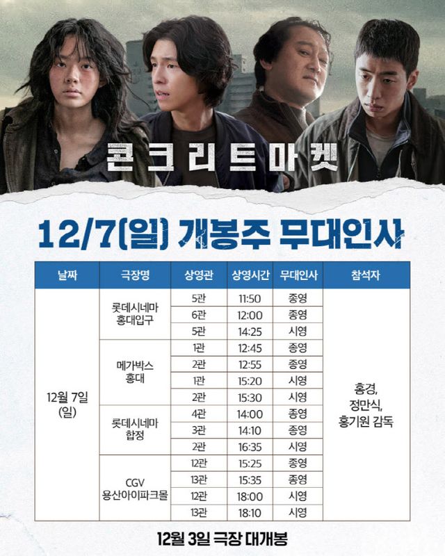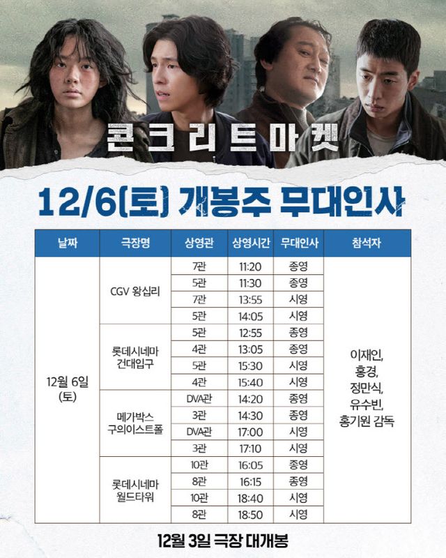 오는 12월 3일 개봉을 기념해 개봉 주 주말동안 진행되는 무대인사는 12월 6일 CGV 왕십리를 시작으로 롯데시네마 건대입구, 메가박스 구의이스트폴, 롯데시네마 월드타워, 7일에는 롯데시네마 홍대입구부터 메가박스 홍대, 롯데시네마 합정, CGV 용산아이파크몰까지 서울 중심지를 모두 순회하며 관객들을 찾아갈 예정이다. 특히 무대인사에는 ‘콘크리트 마켓’의 연출을 맡은 홍기원 감독과 함께 치열한 열연을 펼쳐낸 이재인, 홍경, 정만식, 유수빈 등 영화의 주역들이 참석을 예고해 현장의 분위기가 영화만큼 뜨겁게 달아오를 것으로 기대된다.