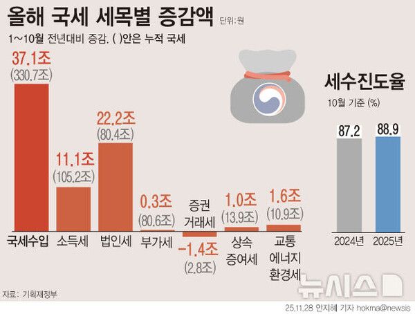 기획재정부가 28일 발표한 '2025년 10월 국세수입 현황'에 따르면 올해 1~10월 누계 국세수입은 330조7000억원으로, 전년 같은 기간보다 37조1000억원 증가했다.