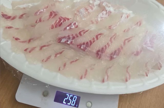 참돔회의 무게는 용기를 포함해 총 258g. 참돔 2kg을 주문했는데 고작 그 정도밖에 안 나왔다는 것이다. 김지민은 "대가리가 큰 걸 고려해도 잘 뜨는 분들은 40%까지 뽑는다. 수율이 보통 38%고 안 나오면 30% 정도다. 평균적으로 35%다"라고 설명했다. 2kg짜리 참돔을 뜨면 700g이 나와야 한다는 것이다.