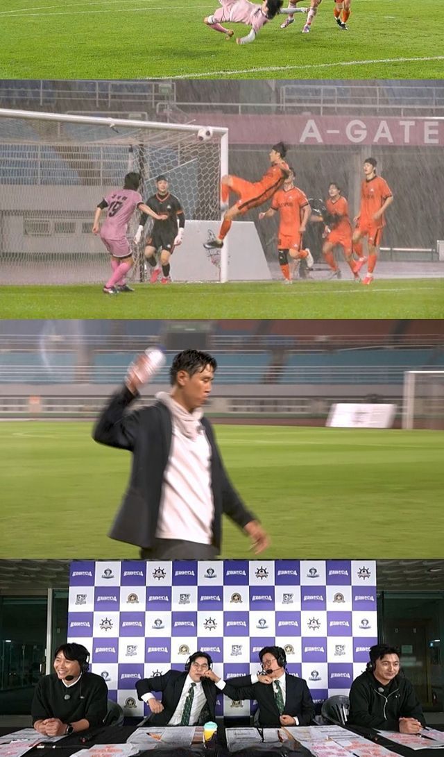 감독들의 대비되는 모습도 흥미롭다. 구자철 감독은 천막 밖으로 뛰쳐나와 선수들과 함께 비를 맞으며, 그라운드와 가장 가까운 자리에서 직접 호흡한다. 반면 김남일 감독은 천막 안에서 젖지 않은 '뽀송뽀송 비주얼'을 유지하며 차분하게 경기를 지켜본다. 극과 극인 두 감독 스타일이 어떤 결과로 이어질지가 관전 포인트다.