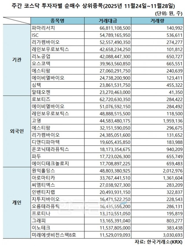 기관 '파마리서치'·외인 '로보티즈'·개인 '원익홀딩스' 1위 [주간 코스닥 순매수- 2025년 11월24일~11월28일]