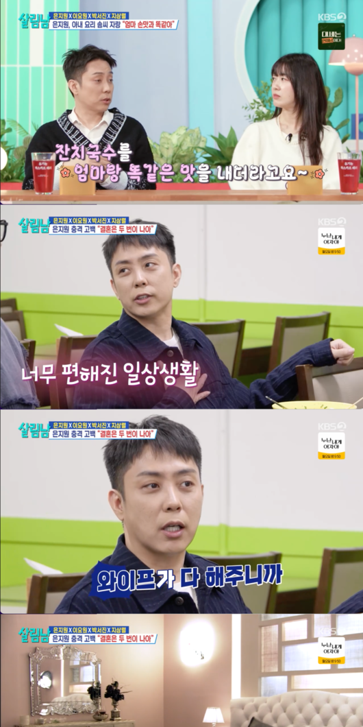 이날 은지원은 아내에 대한 애정을 숨기지 않았다. 그는 아내가 본인 어머니와 똑같은 요리 맛을 낸다는 말에 망설임 없이 "맞다"고 답했다. 특히 자신이 좋아하는 나박김치와 잔치국수를 언급하며 아내의 뛰어난 요리 실력을 자랑해 '사랑꾼'의 면모를 드러냈다.