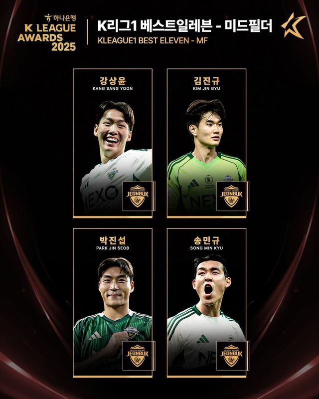 4-4-2 전형의 올 시즌 K리그1 베스트11에선 이동경(울산 HD) 싸박(수원FC) 송민규, 김진규, 박진섭, 전진우, 강상윤(이상 전북) 이명재(대전하나시티즌) 야잔(FC서울) 홍정호(전북) 김문환(대전) 송범근(전북)이 이름을 올렸다.