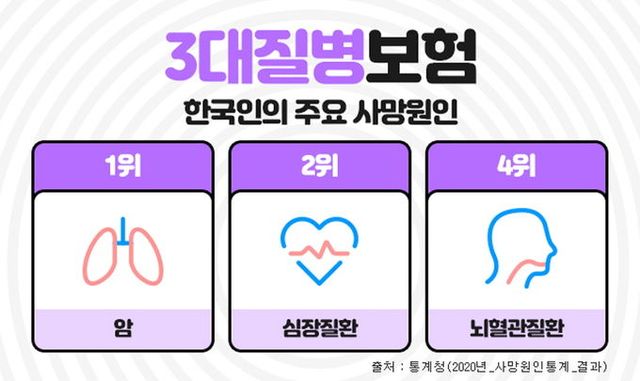 [와이뉴스] 한국인의 주요 사망원인중에 암, 뇌혈관질환, 심혈관질환은 흔히 3대질병이라 일컬어지며 살아가면서 가장 먼저 대비해야 하는 중대질병으로 항상 강조되고 있다. 이들 질병에 미리 대비하기 위해 가입하는 것이 진단비보험인데, 이러한 3대질병진단비를 중점으로 보장하는 보장성보험이 3대진단비보험 이다. 3대질병진단비보험은 각각의 질병에 주목해서 보장하기도 하지만, 나에게 맞는 추가 특약을 잘 골라서 가입한다면 종합건강보험으로도 충분히 활용도가 높다.
