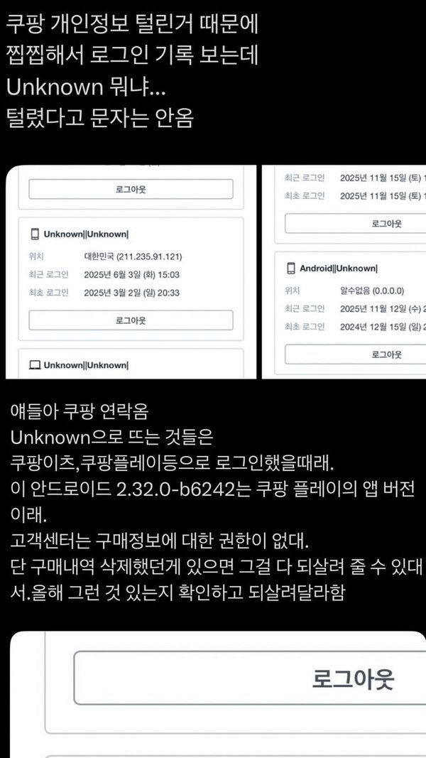 쿠팡 대규모 개인정보 유출 사태 이후, 소셜미디어 X(구 트위터)에서 쿠팡 앱 로그인 기록에 'Unknown(알 수 없는)' 기기 접속이 표시된다는 이용자들의 제보가 잇따르고 있다.