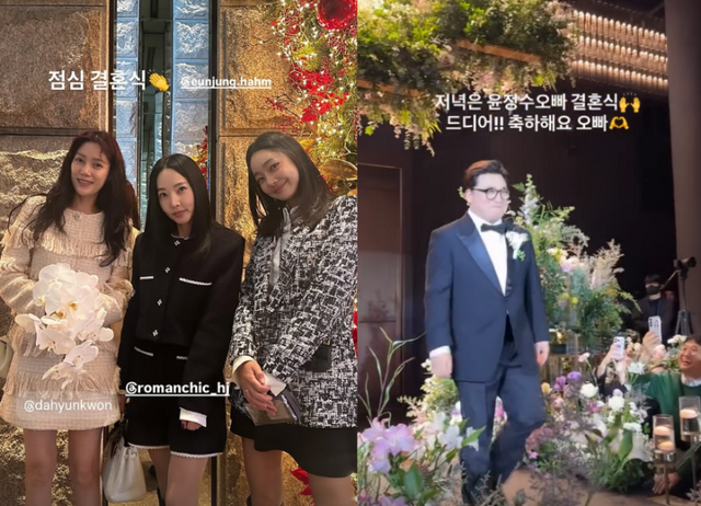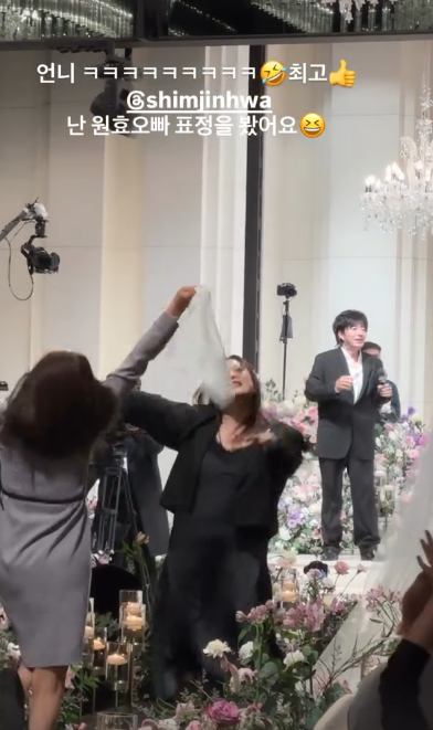 이후 서효림은 “저녁은 윤정수 오빠 결혼식. 드디어!! 축하해요 오빠”라며 방송인 윤정수의 신랑 입장 순간을 담은 영상을 공개했다. 이어 그는 코미디언 심진화가 배기성의 축가에 맞춰 버진로드에서 막춤을 추는 유쾌한 영광으로 현장 분위기를 전달했다.