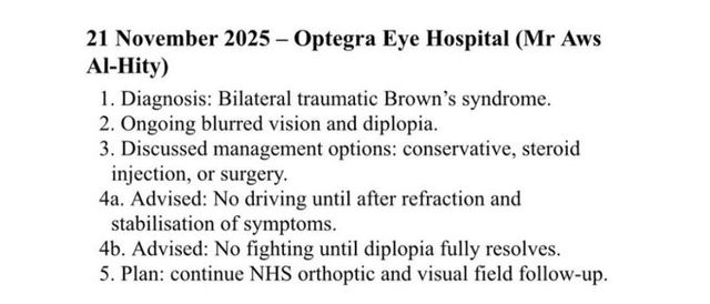 그는 자신의 인스타그램을 통해 의료 보고서를 직접 공개했다. 그가 전한 의료 보고서에는 "양안의 중대한 안구 외상"이라는 표현이 명시돼 있으며, 지속적인 복시(이중 시야), 안와 연부조직 손상, 우측 안와 내벽의 '경미한 골절' 등이 확인됐다.
