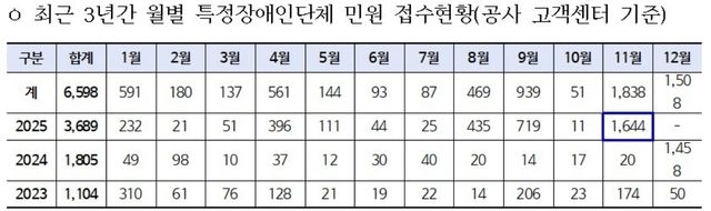 최근 3년간 월별 특정장애인단체 민원 접수현황(공사 고객센터 기준) / 서울교통공사 제공
