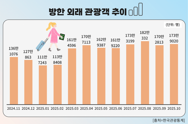 한국관광데이터랩에 따르면 지난 10월 한국을 방문한 외국인 관광객은 173만9020명으로 지난해 같은 달 대비 27.8% 증가했다. K-콘텐츠의 글로벌 확산과 '케이팝 데몬 헌터스'와 같은 콘텐츠 흥행도 한국 방문 수요를 자극한 것으로 분석된다. 그러나 증가한 관광객 규모만큼 비상식적 행동도 포착되며 관광 환경의 질을 우려하는 목소리가 높아지고 있다.