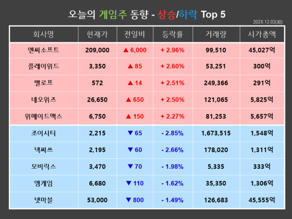반면, 조이시티는 금일(2일) 전거래일 대비 2.85%(65원) 하락한 2,215원에 장을 마감했다. 개인이 268,724주를 순매수한 반면, 기관과 외국인이 각각 449주, 266,927주를 순매도하며 장 초반부터 하락해 약세로 마쳤다.