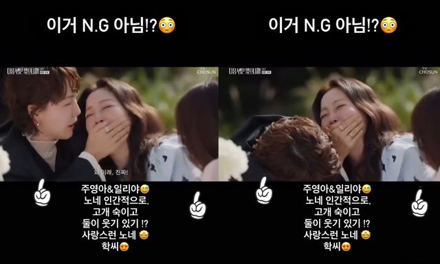 그런 가운데 주연 배우 김희선이 스스로 드라마 속 NG 의심 장면을 공개해 웃음을 안겼다. 김희선은 지난 2일 자신의 계정에 “이거 N.G 아님!? 주영아, 일리야. 노네 인간적으로 고개 숙이고 둘이 웃기 있기!? 사랑스런 노네 학씨”라는 글과 함께 8화의 한 방송 장면을 공유했다.