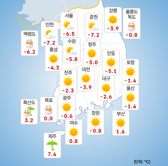 현재 한파주의보는 중부와 경북 북부지방에 발령 중에 있는데 전국적으로 칼바람이 매섭다.