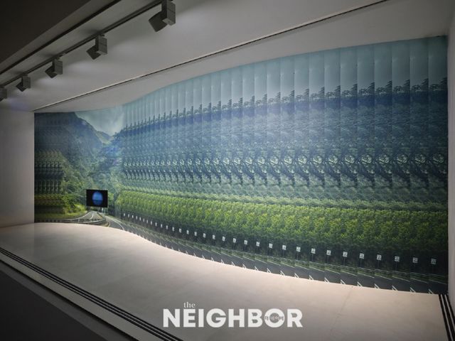 허지은(Gi (Ginny) Huo), ‘라이에로 가는 길’, 2025, 시트지에 디지털 컬러 프린트, 단채널 영상, 16mm 필름, 컬러, 1분 55초, 반복 재생(촬영, 편집 세이프 알 소바이히), 725.8×240cm. 사진 이의록.