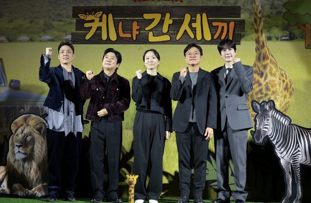 (왼쪽부터) 은지원과 이수근, 김예슬 PD, 나영석 PD, 규현이 예능 '케냐 간 세끼' 제작보고회에서 포즈를 취하고 있는 모습. / 뉴스1-권현진 기자