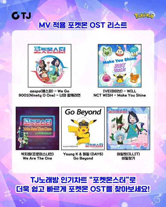 포켓몬코리아는 2023년 8월 론칭한 TV 애니메이션 '포켓몬스터: 리코와 로드의 모험' OST인 에스파(aespa)의 'We Go'를 시작으로, 아이브(IVE), 엔시티 위시(NCT WISH), 데이식스(DAY6)의 영케이·원필, 아일릿(ILLIT) 등 다양한 K-POP 아티스트와 협업을 이어왔다.