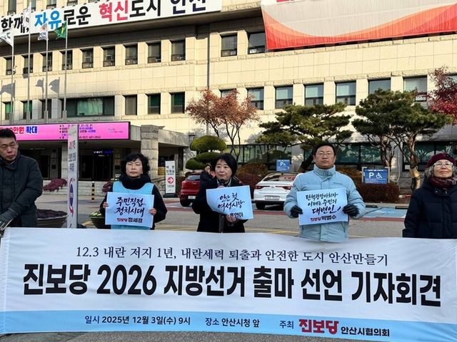 기자회견에는 홍연아 안산시장 출마 예정자, 박범수·정세경 안산시의원 출마 예정자와 당원들이 참석했다. 사회를 맡은 진보당 김도현 안산시상록구지역위원회 부위원장은 “내란수괴 윤석열이 불법 비상계엄을 선포한 지 1년 되는 날”이라며 “그날의 공포는 생생하지만, 국회로 달려갔던 시민들 덕분에 내란을 저지할 수 있었다”고 소감을 밝히며 기자회견을 시작했다.