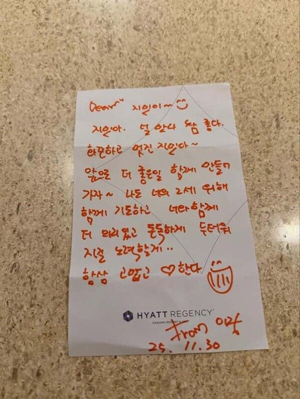 공개된 사진 속 편지는 정이랑이 머물고 있는 하얏트 리젠시 메모장에 적힌 것으로, 정이랑은 "지민아. 널 만나 참 좋다. 화끈하고 멋진 지민아 앞으로 더 좋은 일 함께 만들어 가자~ 나도 너의 2세 위해 함께 기도하고 너와 함께 더 의리 있고 돈독하게 두터워지길 노력할게. 항상 고맙고 사랑한다"라고 진심을 담아 적었다.