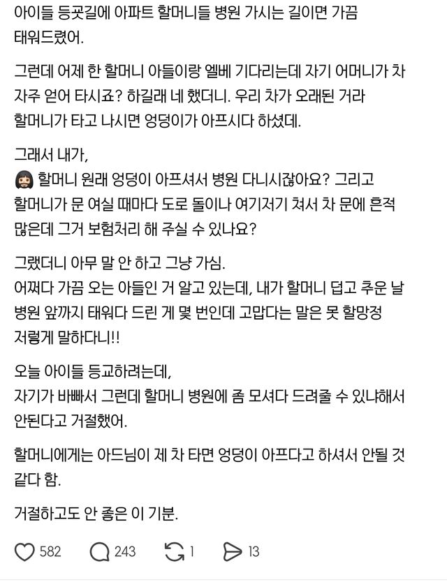 실제로 동네 어르신들 선의로 태워드렸다가 사고나거나 타고나서 아프시다고 보험처리 or 병원비 요구받는 경우는 사례가 종종 있다고...