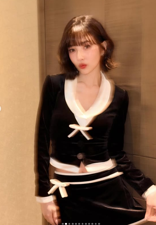 사진 속 조이는 블랙 벨벳 소재의 미니 스커트와 크롭 재킷을 매치한 사랑스러운 스타일링을 선보였다. 화이트 칼라와 소매단, 그리고 상의와 스커트에 장식된 리본 포인트가 마치 고급스러운 세일러 룩을 연상케 한다. 특히 턱선까지 오는 단발 헤어스타일과 함께 더욱 도드라지는 그의 뚜렷한 이목구비와 군살 없는 체형이 팬들의 감탄을 자아냈다.