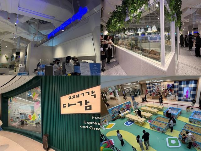 (왼쪽 상단부터 시계 방향으로)다양한 해양 생물과 파충류를 관찰할 수 있는 도심 속 아쿠아리움 카페 '어푸어푸', 1층에 마련된 '핑크퐁 팝업 놀이터', 오감형 놀이·키즈클래스 '째깍다감' 입구 모습. = 이인영 기자