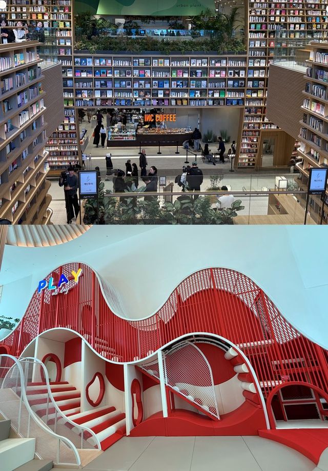 수많은 서적이 시선을 압도하는 '센트럴 파드'(위) 모습과 3일 기준 안전 점검 중인 어린이 놀이시설 '업스테어'. = 이인영 기자
