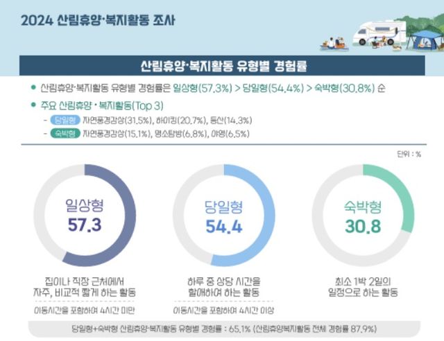 이는 2024년 80.7%보다 7.2% 증가한 수치이며, 활동 유형별로 경험률을 살펴보면 일상형은 57.3%, 당일형 54.4%, 숙박형 30.8%로 모든 활동에서 전년 대비 활동률이 고르게 증가했다.