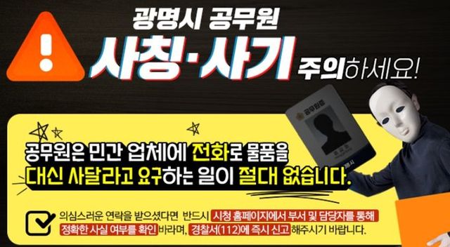 [와이뉴스] 광명시는 최근 공무원을 사칭한 사기 사례가 지속적으로 발생하자 지역 소상공인과 자영업자에 각별한 주의를 당부했다.
