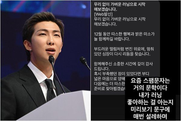 RM은 이어 “내가 러닝 좋아하는 걸 아는지 미리보기 문구에 매번 설레하며 또 낚인다”고 덧붙이며 스스로 ‘스팸 단골 피해자’가 됐다고 너스레를 떨었다.