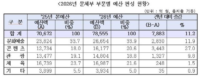 부문별 비중은 문화예술 2조6654억원, 콘텐츠 1조6177억원, 관광 1조4804억원, 체육 1조6987억원, 기타 3934억원이다. 이중 콘텐츠 부문 증가 폭이 가장 크다.