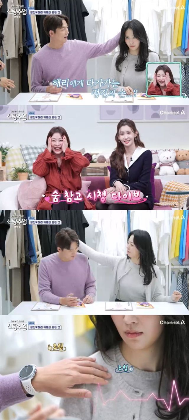 또 이정진은 박해리의 쇄골에 선뜻 손을 대지 못했지만, 박해리는 거침없이 이정진의 쇄골을 만져보며 설레는 분위기를 이어갔다. 이정진도 조심스럽게 박해리의 쇄골을 만져보며 서로의 골격 진단을 해 줬다. 이에 이다해는 "이거 되게 설렌다"라며 환호했다.