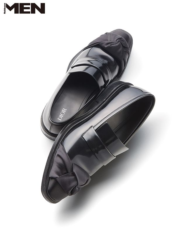 연말 옷차림에 대한 힌트는 디올의 2025 F/W 컬렉션에 있다. 밤낮으로 아름다움만을 좇는 남자의 모습이랄까. 허리를 강조한 페플럼 재킷, 화려한 자수로 뒤덮인 수려한 코트, 실크로 빚은 셔츠 등 각각의 옷들이 저마다 빼어난 얼굴로 런웨이에 등장했다. 하지만 이 호사스러운 옷차림을 현실에서 적용하는 건 결코 쉽지 않은 일. 진짜 해답은 신발이다. 미끄러지듯 유려한 검은색 글레이즈 송아지 가죽 위에 반질반질한 실크로 매듭지은 밴드 장식 로퍼. 청바지 차림에도 이런 신발만 있다면 초대받지 않은 파티라도 가고 싶어질 테다.