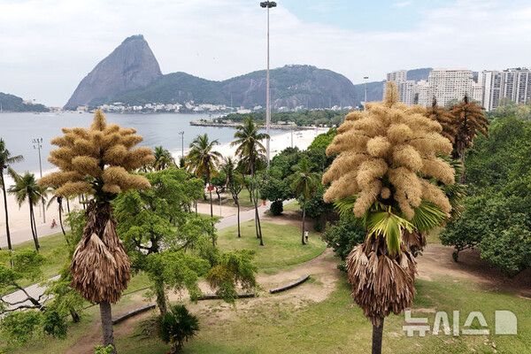 브라질 리우데자네이루 공원에서 높이 솟아오른 탈리포트 야자나무가 1960년대 심어진 지 처음으로 꽃을 피웠다.