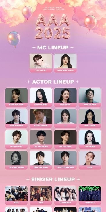 스타뉴스가 주최하고 AAA 조직위원회(조직위원장 박준철)와 모티브(MOTIVE, 대표 조현우), 디쇼(D-SOW)가 주관하는 ‘10주년 AAA 2025’는 배우 부문에 강유석, 김유정, 문소리, 박보검, 박윤호, 사토 타케루, 아이유, 엄지원, 이이경, 이준영, 이준혁, 이준호, 임윤아, 차주영, 최대훈, 추영우, 혜리가 참석한다.
