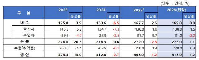 생산은 내수·수출의 동반 회복과 신공장 가동이라는 두 축이 맞물리며 전년대비 1.2% 증가한 413만대로 2년 연속 이어진 역성장에서 벗어나 증가 전환할 것으로 보인다.
