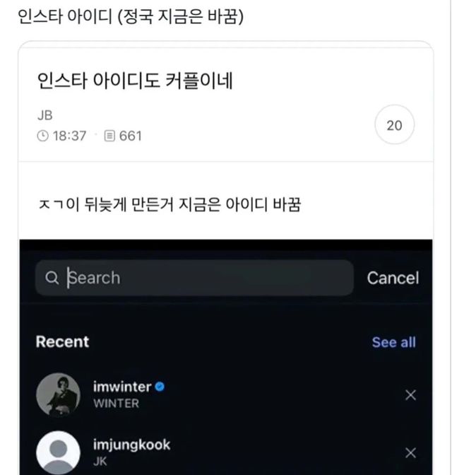 또 다른 누리꾼은 인스타그램 검색 기록을 캡처한 이미지를 공개하며 "인스타 아이디도 커플이네"라고 주장했다. 해당 이미지에는 'imwinter'와 'imjungkook'이라는 계정이 최근 검색 목록에 함께 표시돼 있었다.
