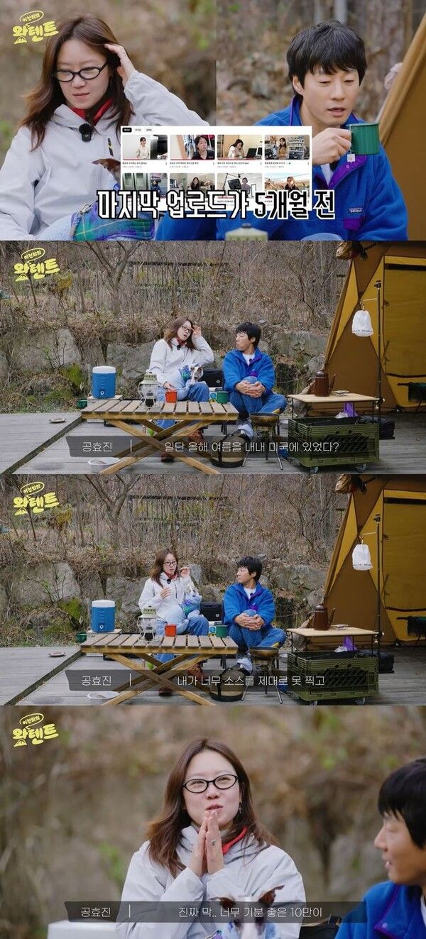 공효진은 "구독자 10만명을 돌파하긴 했다"며 "너무 기분이 좋았는데 영상 업로드 없이 시간이 지나면서 포기했었다. 근데 구독자가 그대로더라"라고 말했다.