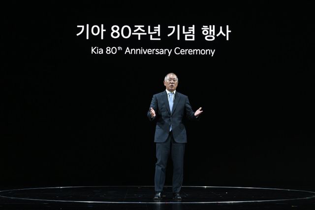정의션 현대차그룹 회장이 5일 경기 용인시 기아 비전스퀘어에서 열린 기아 80주년 기념 행사에서 기념사를 말하고 있다. 기아 제공