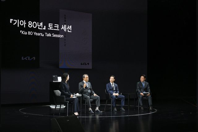5일 경기 용인시 기아 비전스퀘어에서 열린 기아 80주년 기념 행사에서 사사를 편찬한 이장규 기아 고문 등 사내외 인사들이 대담하고 있다. 기아 제공