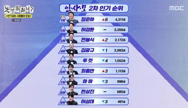 8위는 한상진, 꼴등은 허성태였다. 허성태는 “제일 자존심 상하는 건 상진이 밑이란 거다”라고 했고, 한상진은 “부산 MBC 뉴스까지 나가서 투표를 독려했는데”라고 서운해했다. 이에 주우재는 “저런 게 매력 없는 거다”라고 일갈하기도. 투컷은 “좀 안일했다고 생각한다. 압도적인 표 차이에 마음을 놓고 있지 않았나”라고 반성했다. 투컷은 “좀 안일했다고 생각한다. 압도적인 표 차이에 마음을 놓고 있지 않았나”라고 반성했다. 이후 멤버들은 커버 영상을 제작하기 위해 변신했다.