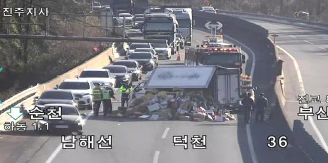 이 사고로 50대 운전자가 경상을 입은 것으로 전해졌다. 차량은 편도 2개 차로를 모두 가로막은 채 전도됐고, 적재된 상자 일부가 도로에 쏟아지기도 했다.