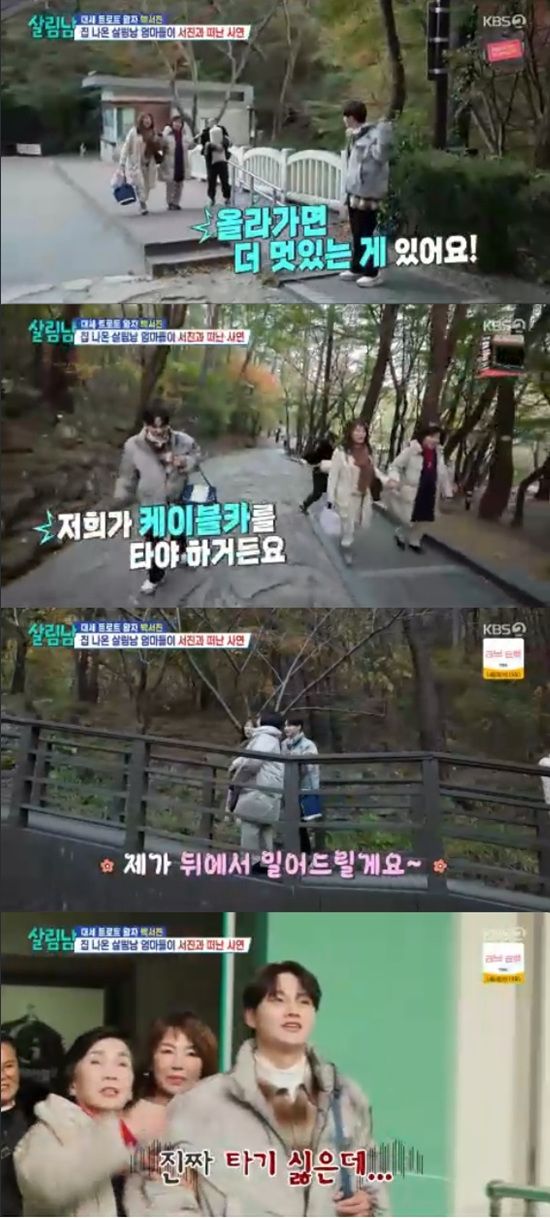 박서진은 케이블카 운행 시간이 얼마 안 남은 터라 빨리 움직이고 싶어 했지만 어머니들은 한 걸음마다 주변을 구경하느라 천천히 걸었다.
