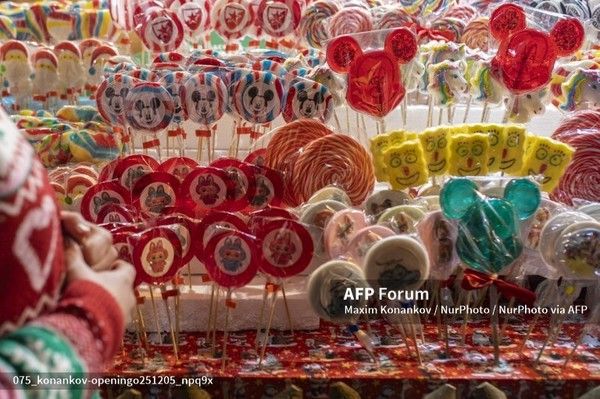 Sells lollipops and other sweets at the opening of the Winter Festival ''Zimzolend'' on Liberty Square in Novi Sad, Serbia, on December 5, 2025.