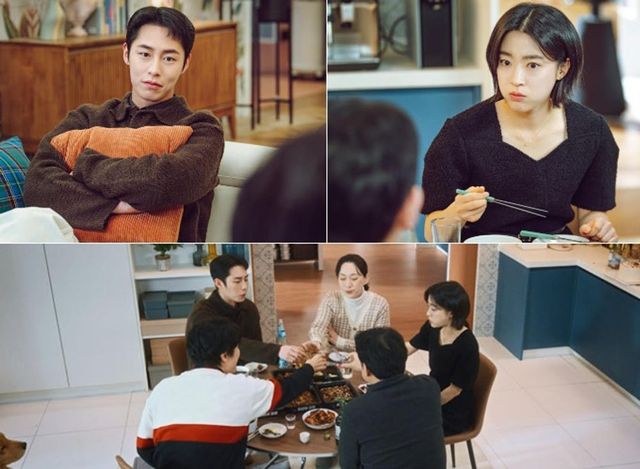 공개된 스틸 속에는 둘만의 오붓한 시간을 기대했던 도하와 하경의 바람과는 달리, 북적이는 집안 풍경이 포착됐다. 도하는 하경과의 계획이 틀어졌지만 침착한 표정을, 하경은 식사 도중 토끼 눈이 된 채 당황한 기색이 역력하다. 두 사람의 로맨틱한 무드를 깬 주인공은 다름 아닌 도하의 부모, 백기호(최병모 분)와 남혜민(우현주 분). 아들 커플의 아쉬운 속내를 아는지 모르는지, 기호와 혜민은 세상 해맑은 표정으로 불쑥 찾아와 웃음을 유발할 예정이다.