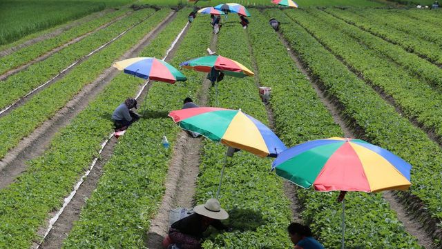 딸기밭에서 일꾼들이 파라솔을 펼쳐두고 뙤약볕을 피해 일하고 있다. 기사의 이해를 돕기 위한 사진 / 뉴스1