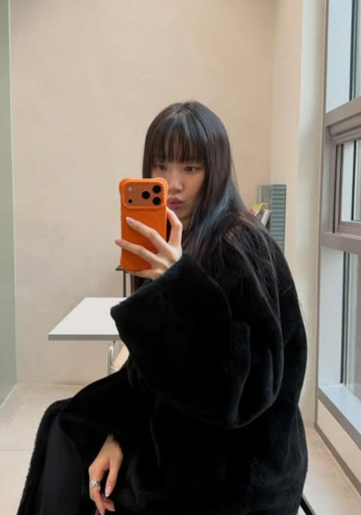 자신의 휴대폰으로 거울 셀카를 찍는 모습에서는 카메라를 가득 채우는 문가영의 독보적인 분위기가 느껴진다. 부드러운 소재의 검은색 코트와 선명한 오렌지색 휴대폰 케이스가 대비를 이루며 스타일리시함을 더했다.